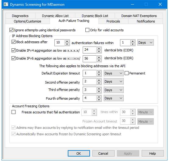 This option applies to the IP Address Blocking Options and to the Account Freezing Options below. By default, when an authentication attempt fails, subsequent authentication attempts will be ignored when using the same password. They will not count against the number of failures allowed before blocking the IP address or freezing the account. Multiple attempts using the same, incorrect password typically occur when, for example, the user's email password has changed or expired and their client is automatically attempting to log in using the old one.