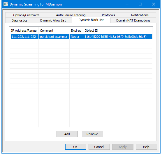 The Dynamic Block List contains the list of IP addresses or address ranges that will be blocked by the Dynamic Screening service when they attempt to connect to MDaemon. Addresses can be added automatically by the Auth Failure Tracking and SMTP Screen options, and added manually by clicking the Add button. Each entry contains the IP address or range, the date and time that the entry will expire (or "Never," if it won't expire), any comment that you wish to make about the entry, and an Object ID.