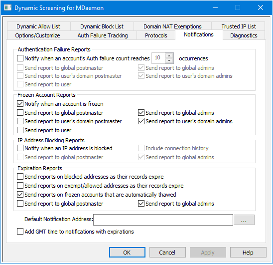 This option causes MDaemon to send a notification message to a postmaster or other selected recipient any time an account is blocked by the Dynamic Screening system. If none of the selected addresses can be resolved, MDaemon will send the message to the Default Notification Address designated below. If no address has been specified, the message will not be sent. The option is disabled by default.