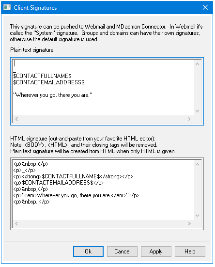 This area is for inserting a plain text signature. If you wish to designate a corresponding html signature to be used in the text/html part of multipart messages, use the HTML signature area below. If a signature is included in both places then MDaemon will use the appropriate one for each part of the multipart message. If no html signature is specified then the plain text signature will be used in both parts.