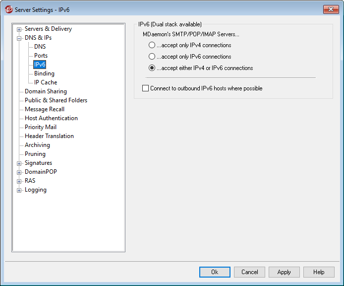 When MDaemon connects to an IPv6 host it must use an IPv6 local address of its own. The IPv6 address is designated on the Domain Manager » Host Name & IP screen. If necessary, an address for outbound socket binding can be specified on the Binding screen.