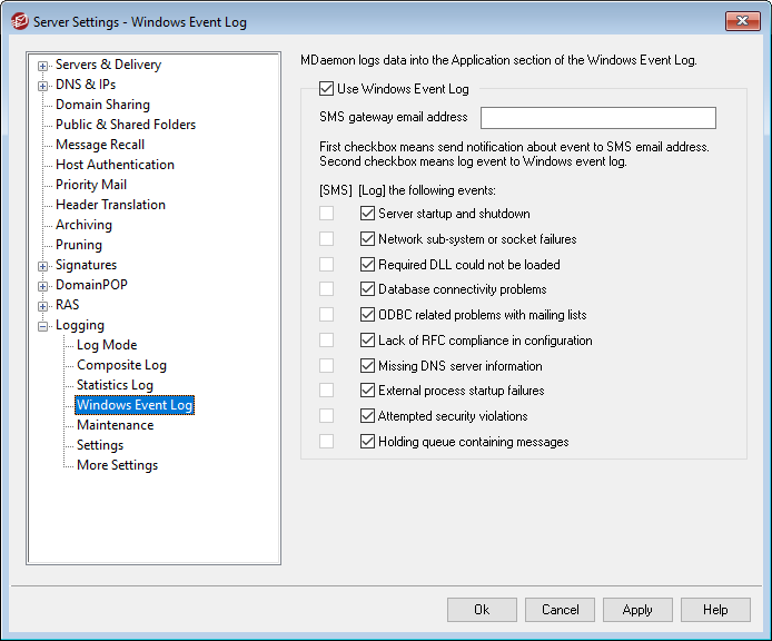 Use the SMS options to designate the events you wish to send to a device via text message. Use the Log options to designate the events that you wish to log to the Application section of the Windows Event log. To send SMS messages you must specify the email address of your phone carrier's email-to-SMS gateway in the option above. Further, any event that triggers a notification message to the SMS gateway will cause the remote queue to be processed; the notifications will be treated as and "urgent" email.