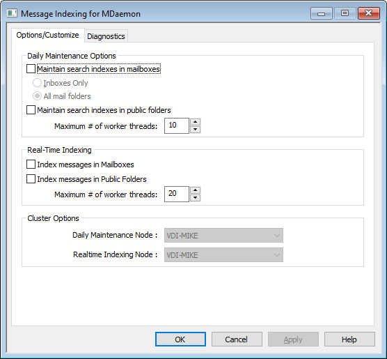 The Message Indexing dialog is used for the configuration of real-time and nightly maintenance of the search indexes used by Webmail, ActiveSync, and Remote Administration.