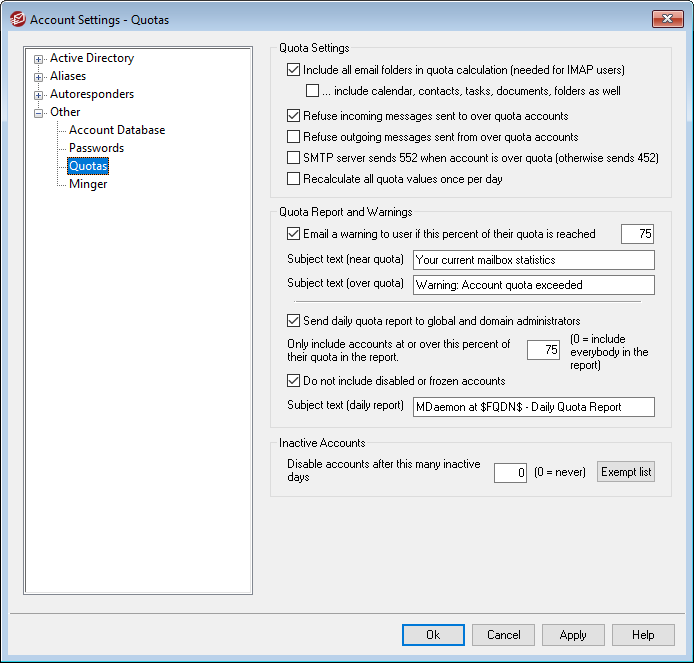 Use this option if you wish to disable accounts automatically that have been inactive for more than a specified number of days. Once the maximum number of inactive days has been reached, the account is disabled and an email is sent to the postmaster. Replying to the email will re-enable the account. Processing is done as part of the midnight cleanup event each night. The default is 0 (disabled).