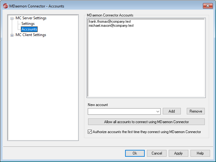 To add an MDaemon account to the list of authorized MDaemon Connector Accounts, select the desired account from this drop-down list and then click Add. To remove an account, select the account and then click Remove.