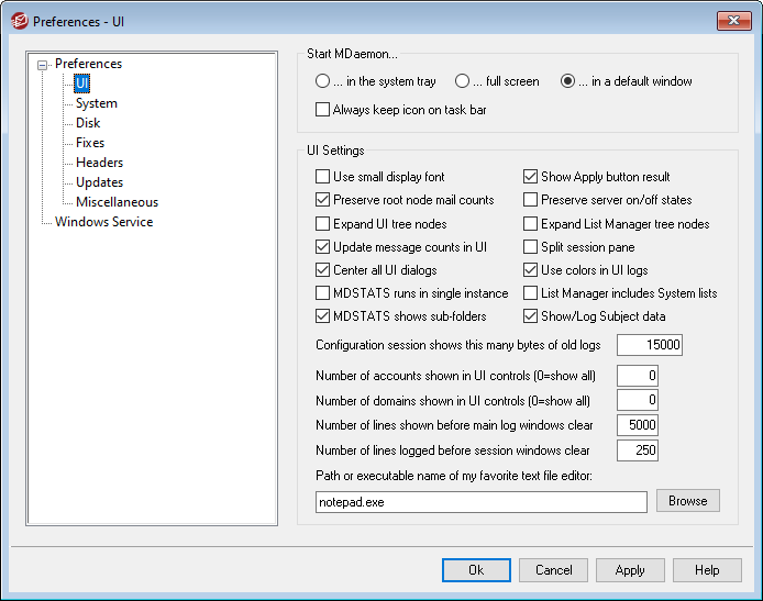 Notepad.exe is the general text editor that the MDaemon UI will launch by default when needed. If you prefer to use a different text editor, enter its file path or executable name here.
