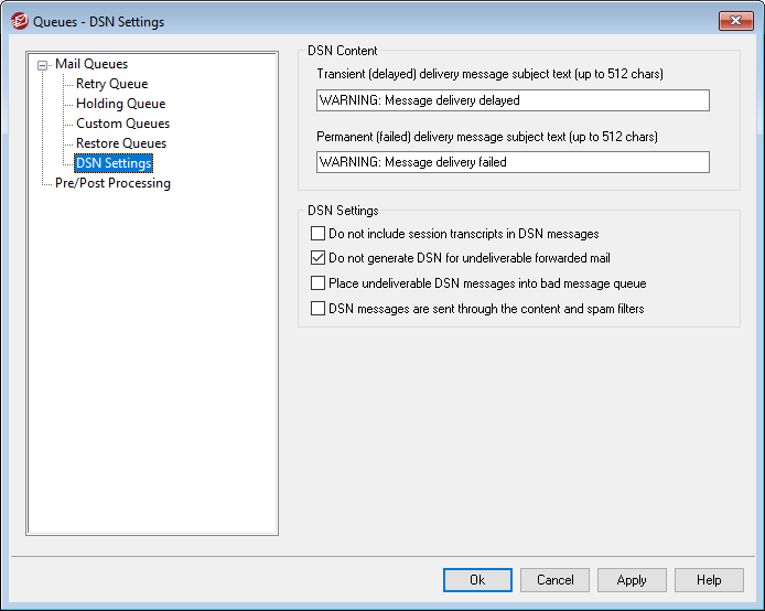 When MDaemon has a problem delivering a message, whether it is a temporary or permanent delivery failure, a Delivery Status Notification (DSN) message is sent to the sender of the message. This screen contains various options related to those DSN messages. It is located at: Queues » Mail Queues/DSN... » DSN Settings.