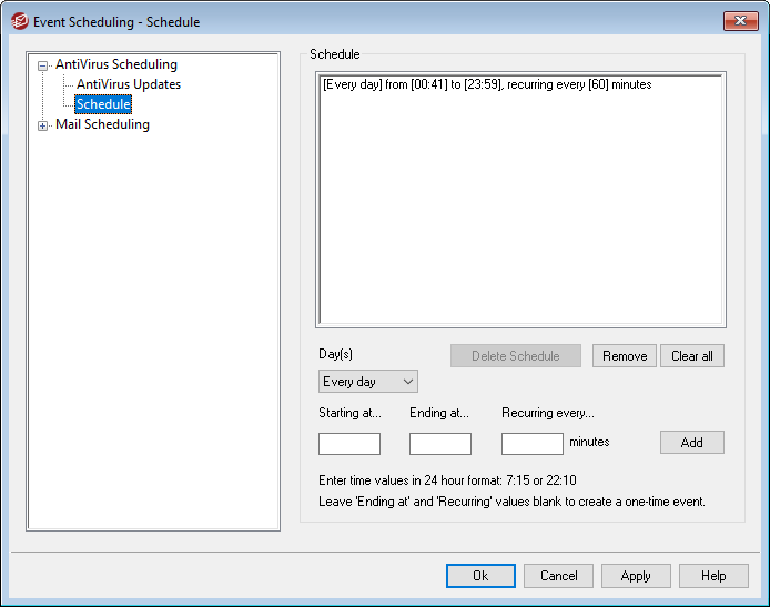 This is the time interval at which AntiVirus will check for updates between the designated Starting at... and Ending at... times. Leave this option blank if you wish it to be a single event rather than recurring event.