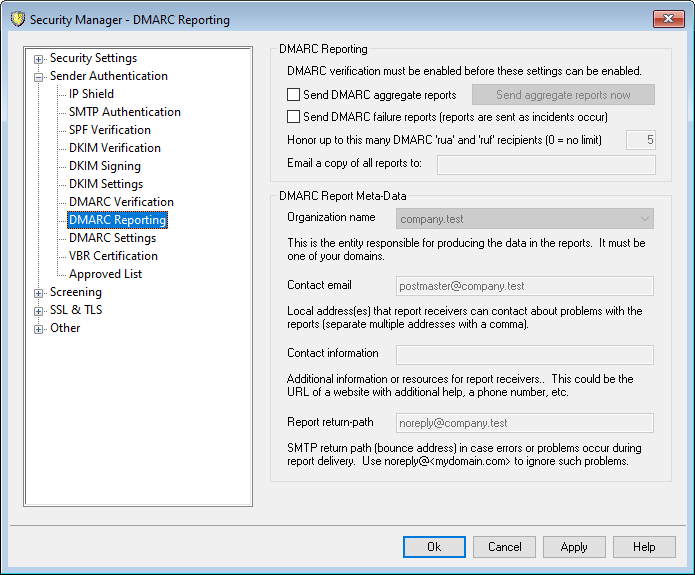 When MDaemon queries DNS for a DMARC record, the record may contain various tags indicating that the domain owner wishes to receive DMARC reports regarding messages claiming to be from that domain. The options on the DMARC Reporting screen are for designating whether or not you wish to send DMARC aggregate or failure reports to the domains whose DMARC records request them, and for specifying the meta-data those reports will contain. The options on this screen are only available when the "Enable DMARC verification and reporting" option is enabled on the DMARC Verification screen. Further, the DMARC specification requires the use of STARTTLS whenever it is offered by report receivers. You should therefore enable STARTTLS if possible.