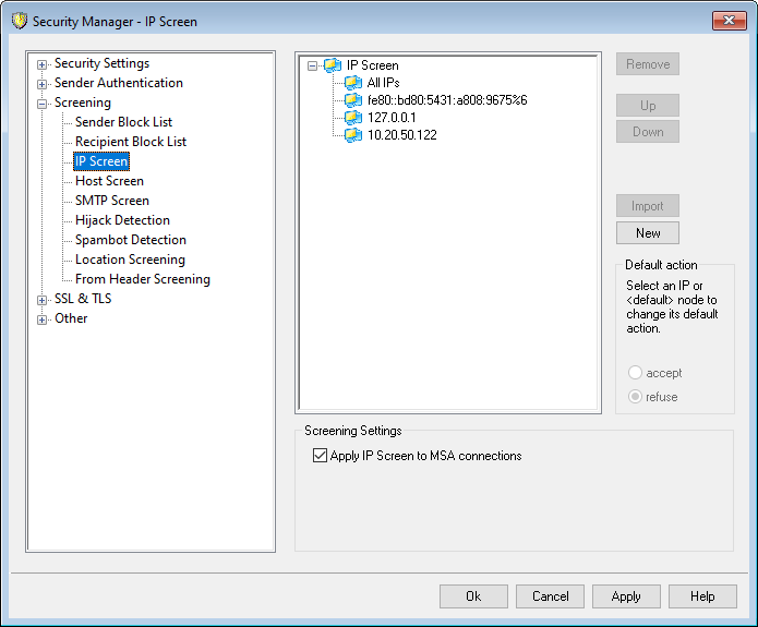 Use this option to apply IP Screening to connections made to the server's MSA port. Normally this is not necessary. This setting is enabled by default.