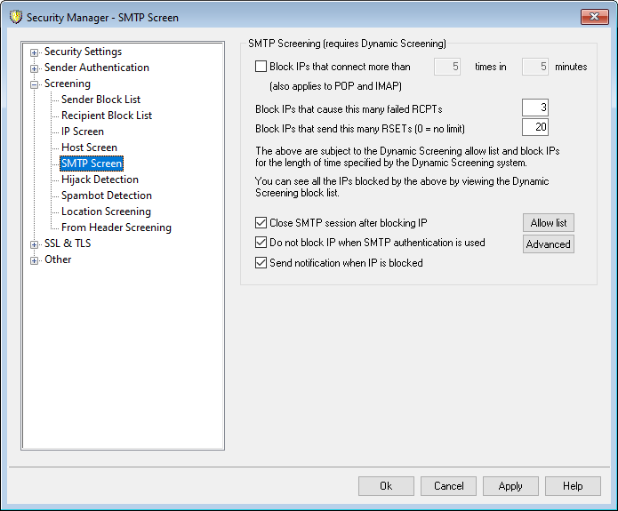 Using the SMTP Screen you can block IP addresses that connect to MDaemon too many times within a specified number of minutes. You can also block those the cause too many failed RCPTs, and those that send too many RSET commands. The SMTP Screen requires Dynamic Screening and uses the Dynamic Block List and Dynamic Allow List.