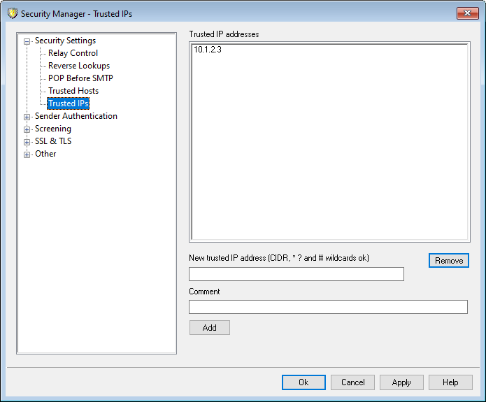 On various dialogs and security features throughout MDaemon you will see options that allow you to choose whether or not "Trusted IPs" will be exceptions to or exempt from those options. The IP addresses you list on this screen are the ones to which those options refer.