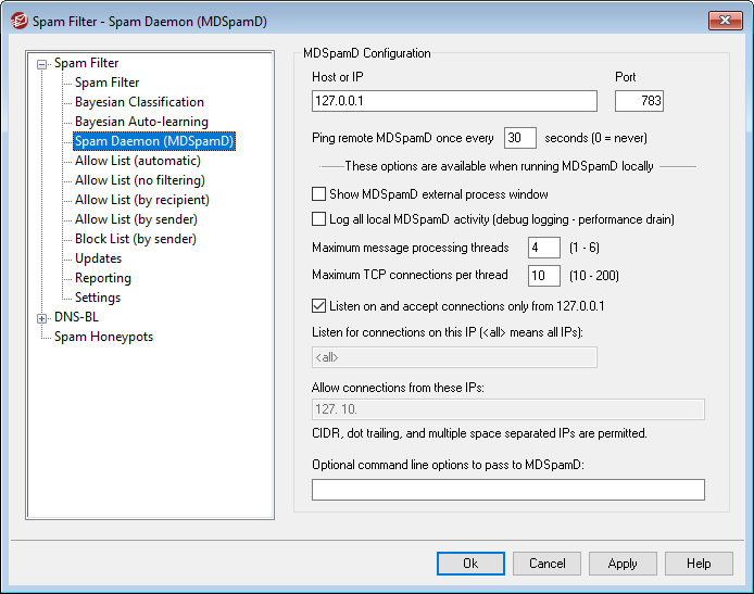 This is the host or IP address to which MDaemon will send messages to be scanned by MDSpamD. Use 127.0.0.1 if MDSpamD is running locally.