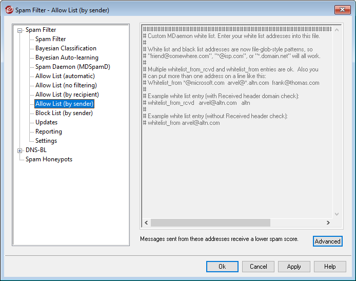 Click Advanced to add addresses to this list. This allow list is similar to Allow List (by recipient), except that spam score reduction is based on who the message is from rather than based on the recipient. Messages from these senders will have their Spam Filter score reduced by the amount specified on the Spam Filter Settings screen. Therefore including an address on this allow list does not automatically guarantee that a message to that address will not be considered spam. For example, if you have the spam score threshold set to 5.0 and the allow list value set to 100, and then a particularly excessive spam message arrives that gets a spam score of 105.0 or higher before the allow list value is subtracted, then the final spam score of the message will be at least 5.0, thus denoting it as spam. This is highly unlikely, however, because spam rarely has a value that high unless it contains some other exceptionally high-scoring element, such as a blocked address.