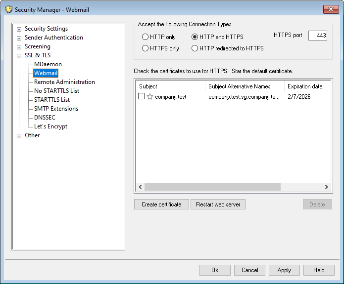 This screen only applies to Webmail when using MDaemon's built-in web server. If you configure Webmail to use some other web server such as IIS, these options will not be used SSL/HTTPS support will have to be configured using your the other web server's tools.