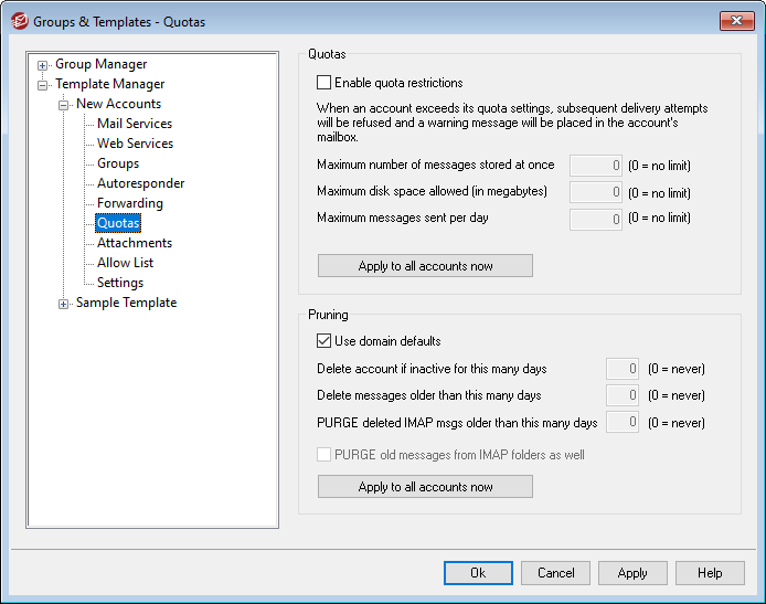 Check this box if you wish to specify a maximum number of messages that accounts controlled by this template can store, set a maximum amount of disk space that the accounts can use (including any file attachments in each account's Documents folder), or designate a maximum number of messages that the accounts can send via SMTP per day. If a mail delivery is attempted that would exceed the maximum message or disk space limitations, the message will be refused and an appropriate warning message will be placed in the user's mailbox. If a MultiPOP collection would exceed the account's maximum a similar warning is issued and the account's MultiPOP entries are automatically switched off (but not removed from the database).