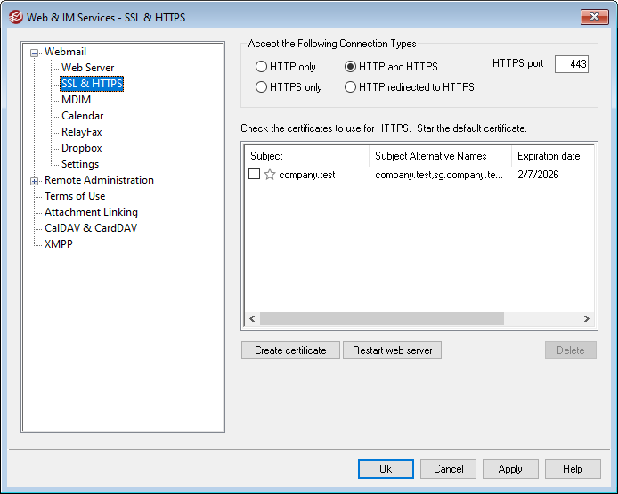 This screen only applies to Webmail when using MDaemon's built-in web server. If you configure Webmail to use some other web server such as IIS, these options will not be used SSL/HTTPS support will have to be configured using your the other web server's tools.